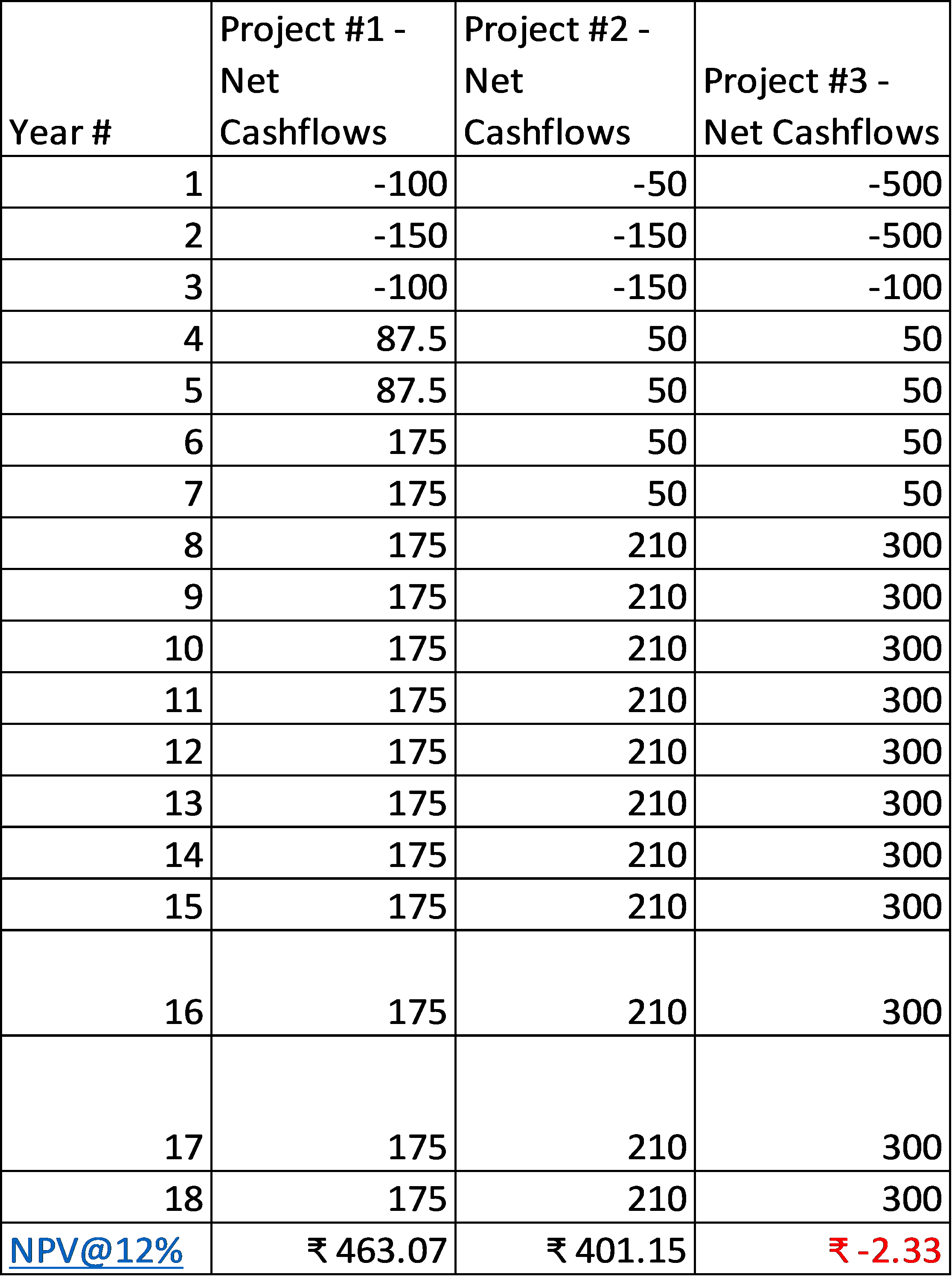 In order to evaluate the investment projects, we must consider the project cashflows over the life of the project. Most of the real-life projects have multi-period cashflows. For example, consider the cashflows of the three projects given below – Project #1 , Project #2 and Project #3.