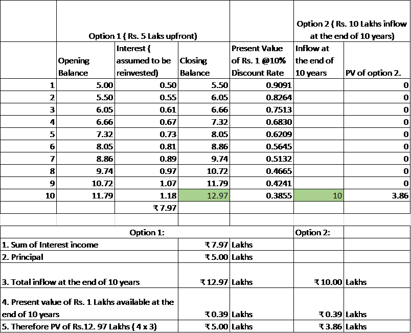 If you were to choose receiving Rs. 10 Lakhs payment at the end of 10 years, you are forgoing an opportunity to earn 10% return on Rs. 5 Lakh that you would have received today. Had you opted for Rs. 5 Lakhs, you would be left with Rs. 12.97 Lakhs at the end of 10 years.