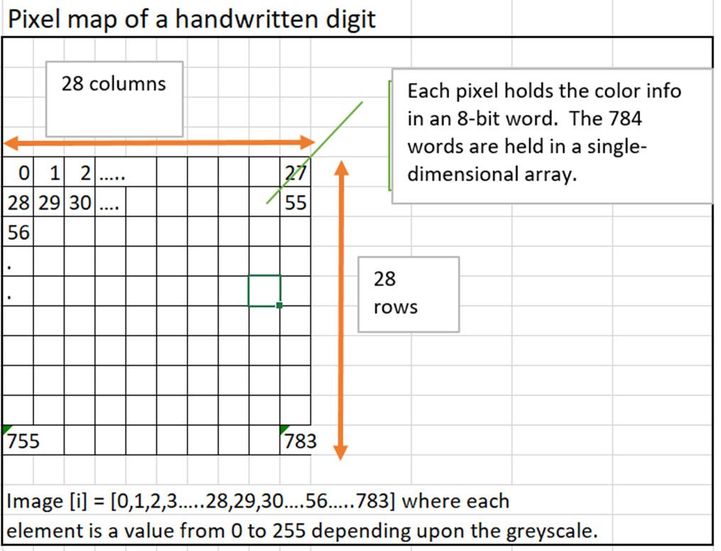 As a first step to developing a solution for recognition of the digits, we need to translate the digits into a machine-readable format. Just uploading the handwritten digits as an image, for example won’t work. We have to break up the images into small pixels and each pixel must carry the information on the colour of the pixel. Let us consider a pixel frame of 28 x 28 = 784 pixels. The colour of each pixel is represented by an 8-bit number. Each pixel value denotes the colour in greyscale. Zero means black and 255 denote white. Each digit is an array of 784 numbers with each number holding the information on which pixel is black or white or a shade of grey.