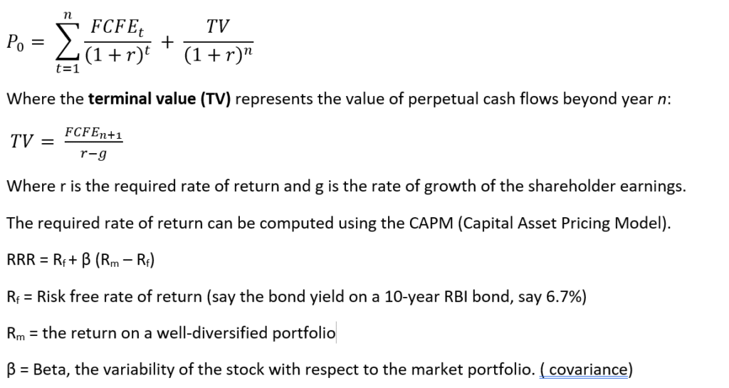 When it comes to valuing a stock, what are the relevant cashflows that we must consider? One obvious cashflow is the dividend stream from the stock but the problem is not all companies declare dividends consistently and those who declare dividends may not share all the available surplus. We would therefore consider FCFE (Free Cashflow to Equity) streams for valuing an equity. The FCFE is all the cashflow available to a common stock holder after operational expenses, capital expenses and net debt payments. For a comprehensive review of all the different models of Equity valuation, please refer to my blog on Equity Valuation Models.